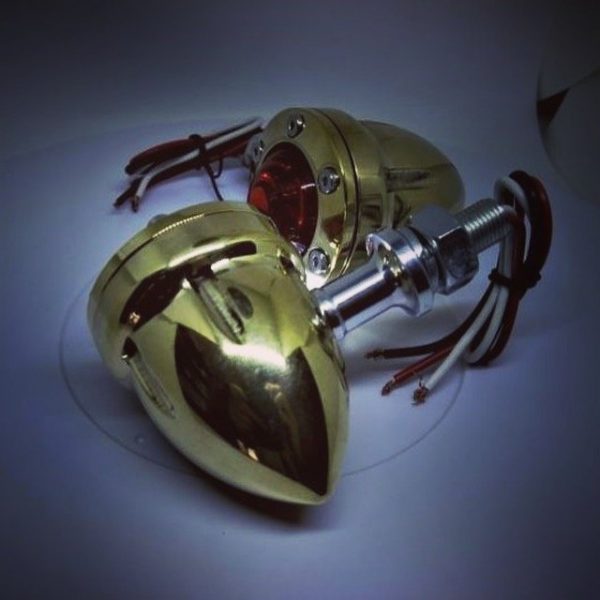Surely the most beautiful pair of brass turn signals on the market: Pair of Hold Fast turn signals with anodized brass finish to give a vintage look to your Bobber, chopper, or café racer.